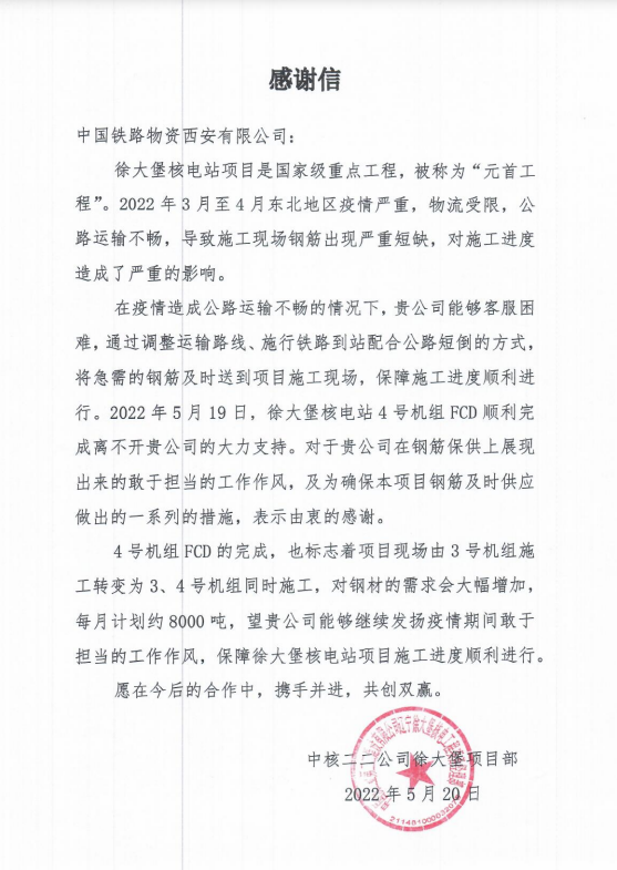 近日,西安公司收到中國核工業(yè)第二二建設(shè)有限公司徐大堡核電站項(xiàng)目部發(fā)來的感謝信。